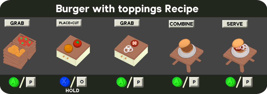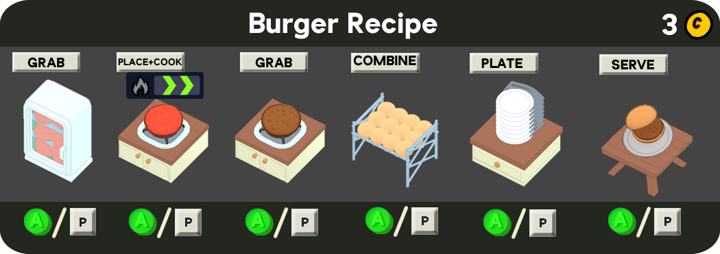 Burgers are one of the Main Recipes chosen in the Headquarters to start a run. They are initially quick and simple to make, comprising only a Cooked Patty and Burger Bun.