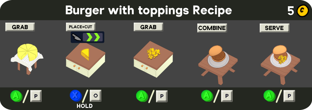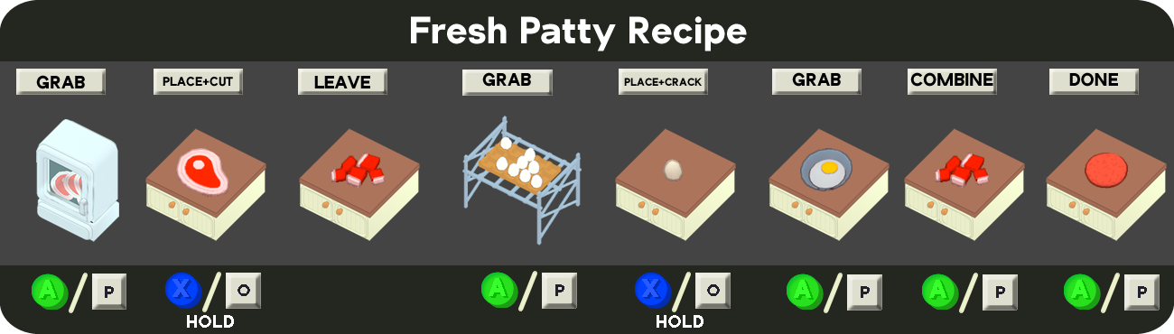 The following items are granted once this Card is chosen, unless already required by another Recipe. They will also begin appearing as Blueprints. Additionally, Patties are removed from the restaurant, since they must now be prepared fresh.