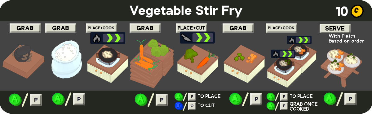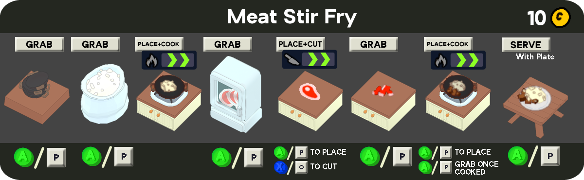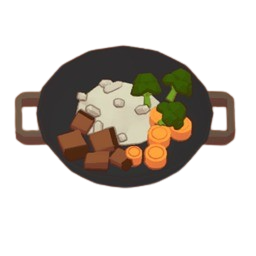 Stir Fry is one of the Main Recipes chosen in the Headquarters to start a run. It is one of the most complex initial Recipes, involving Woks and multiple cooking stages.